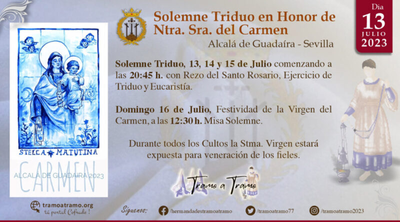 La Hermandad Carmelita del Santo Entierro de Cristo comienza con la celebración de los Solemnes Cultos en honor de Ntra. Sra. del Carmen, SOLEMNE TRIDUO durante los dias 13, 14 y 15 de julio comenzando a las 20:45 h. con el rezo del Santo Rosario, Ejercicio de Triduo y Eucaristia. La predicación estara a cargo de Rvdo. Sr. D. Francisco Javier Criado Martinez parroco de San Sebastian, Director Espiritual de la Hermandad y Arcipreste de la Ciudad.