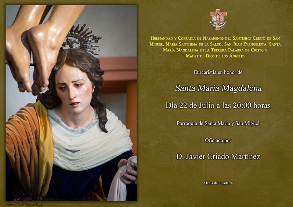 La Hermandad de la Tercera Palabra del barrio de las beatas celebra Eucaristia en honor de Santa María Magdalena el día 22 de julio a las 20:00 h. en la parroquia de Santa María y San Miguel. Oficializada por D. Javier Criado Martínez.